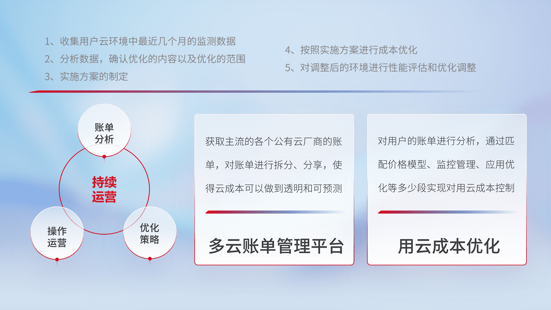 通过多云纳管,,以统一的资源数据模型把客户的云资源进行抽象和封装,,进而实现对多云资源的统一操作,,,保障云资源管理的可靠性、、、稳定性与可用性。。。量身定制化运维内容,,,配置、、、开发运维、、补丁管理、、、备份、、监控、、认证和访问管理、、、、审计和日常巡检等,,,,保障在用云过程中的可靠度,,,,稳定度以及高可用率。。。。